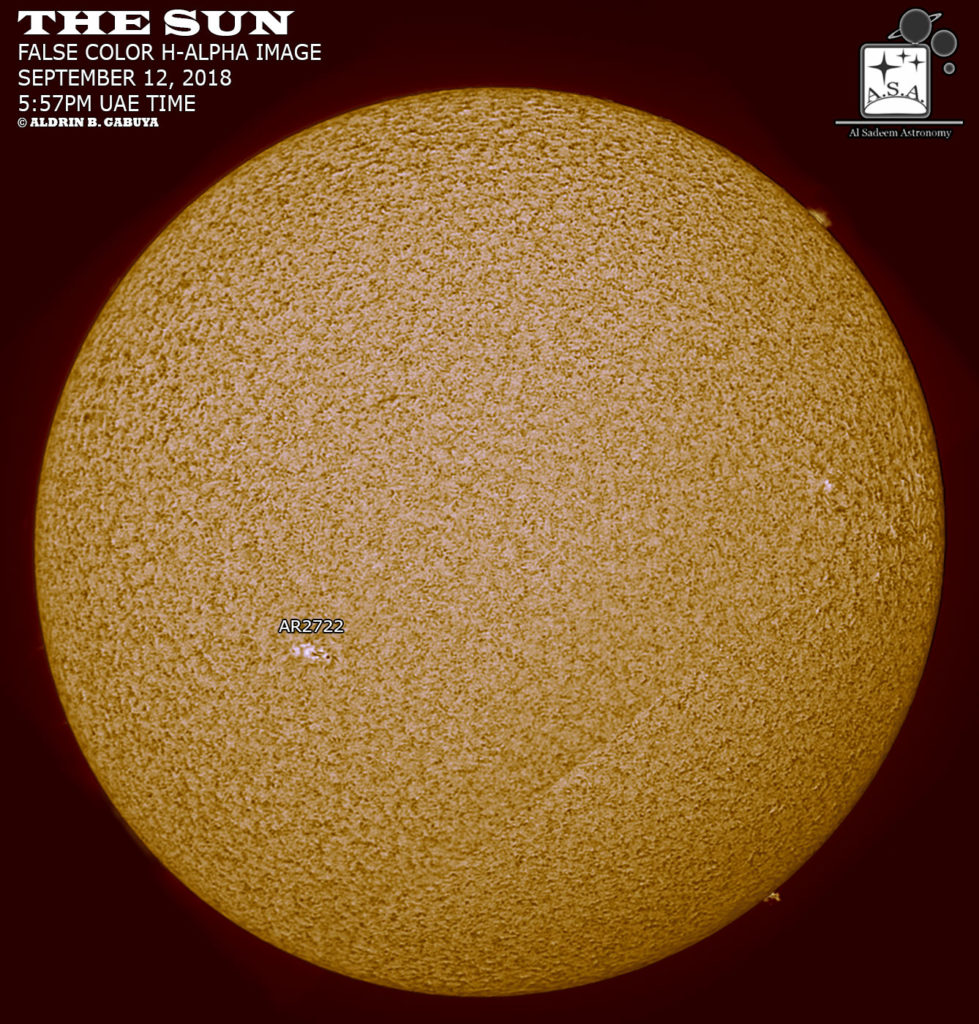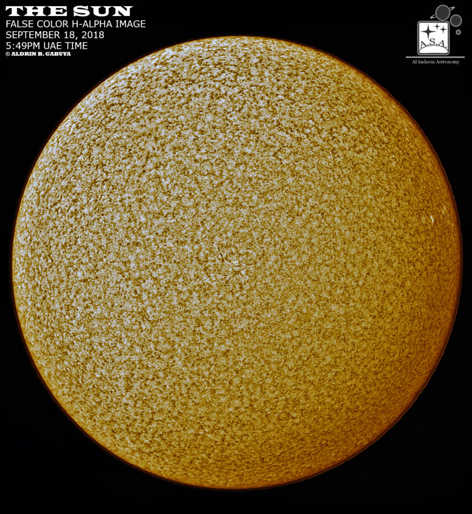 Here are today’s solar images taken from Al Sadeem Observatory, September 12, 2018. The sky was clear with light air turbulence making the seeing and transparency good at the time these images were taken.