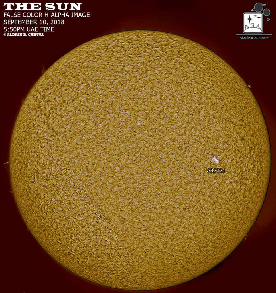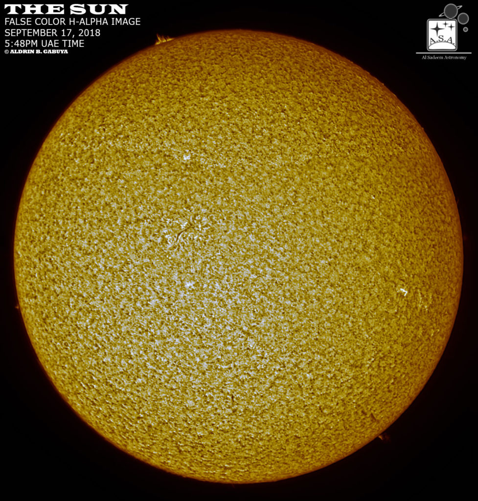 Here are today’s solar images taken from Al Sadeem Observatory, September 10, 2018. The sky was clear with light air turbulence making the seeing and transparency good at the time these images were taken.
