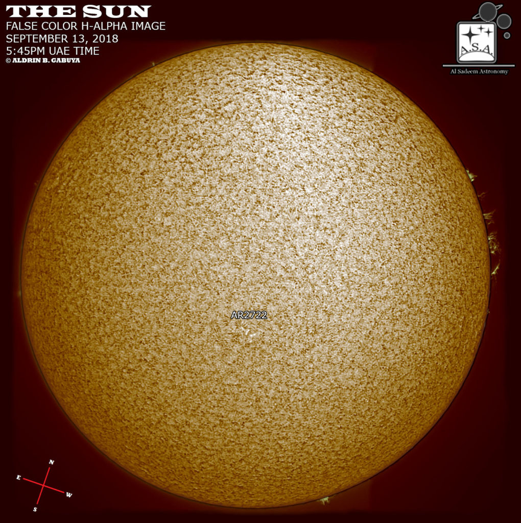 Here are today’s solar images taken from Al Sadeem Observatory, September 13, 2018. The sky was clear with some light breeze making the seeing and transparency average at the time these images were taken.