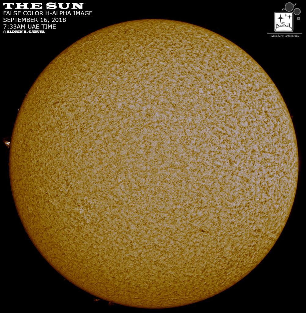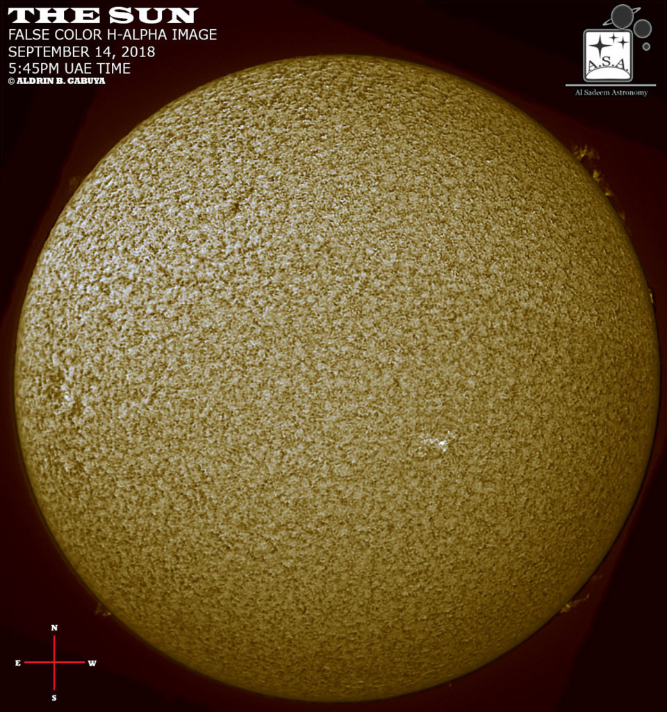 Here are today’s solar images taken from Al Sadeem Observatory, September 14, 2018. The sky was clear but experience intermittent light to moderate breeze making the seeing and transparency average at the time these images were taken.