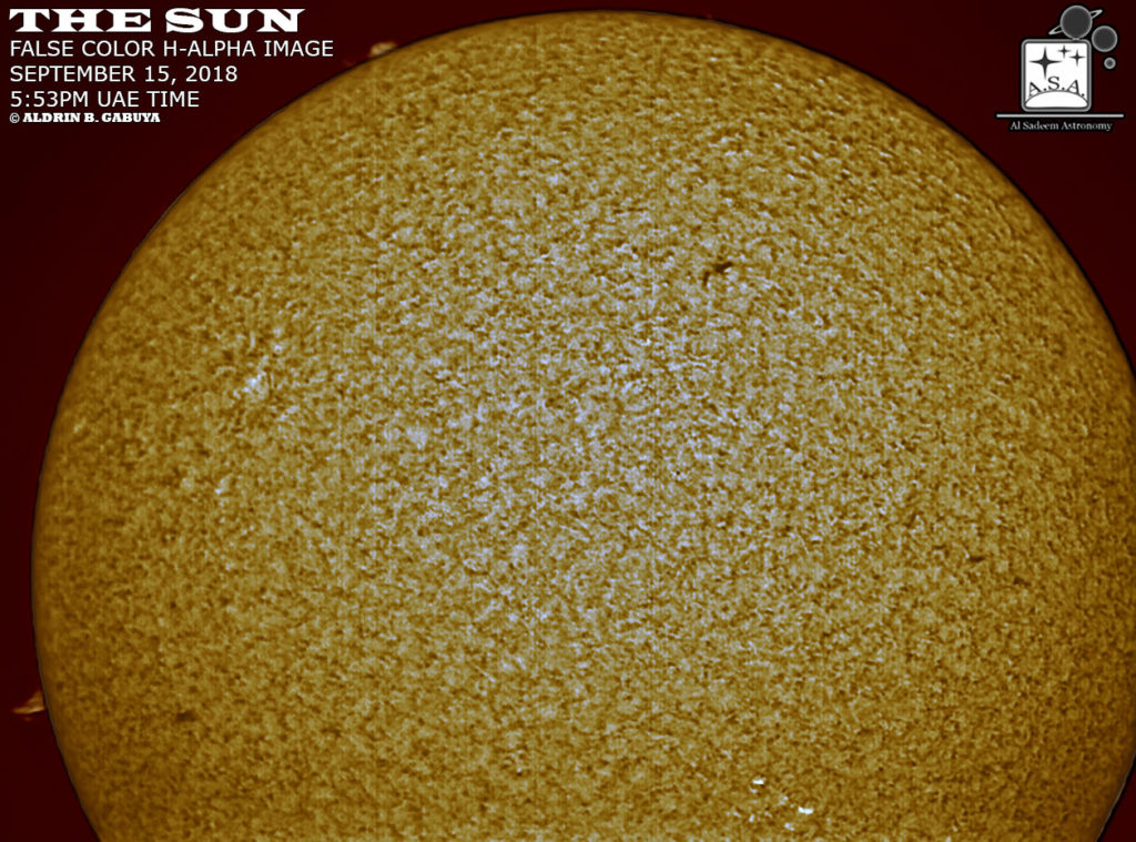 Here are today’s solar images taken from Al Sadeem Observatory, September 15, 2018. The sky was mostly clear but with light to moderate air turbulence making the seeing and transparency average at the time these images were taken.