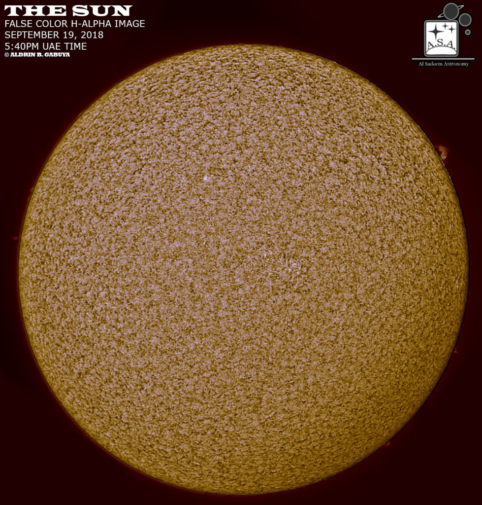 Here are today’s solar images taken from Al Sadeem Observatory, September 19, 2018. The sky was clear with light air turbulence making the seeing and transparency good at the time these images were taken.