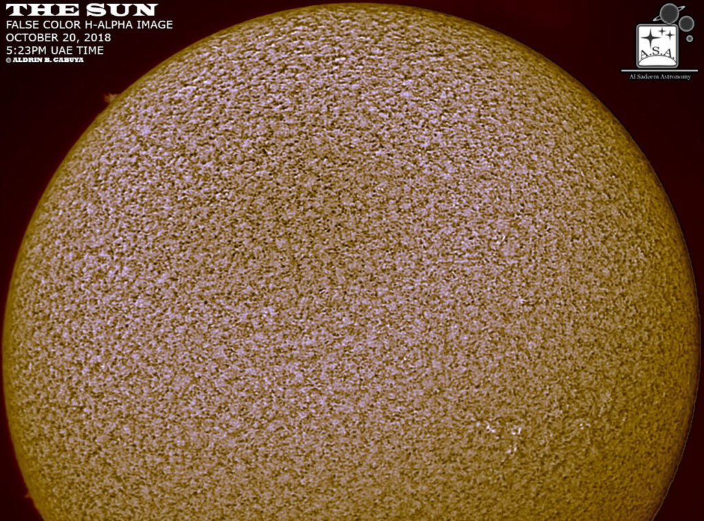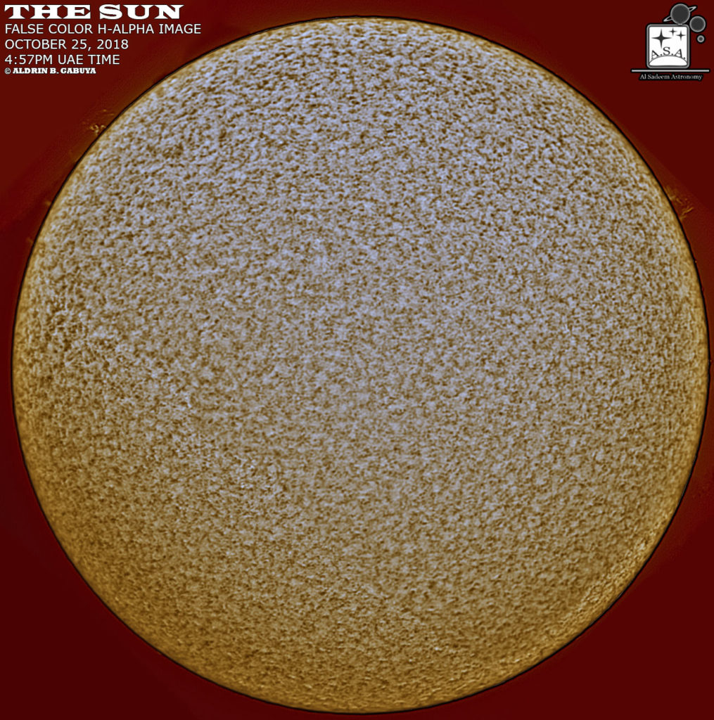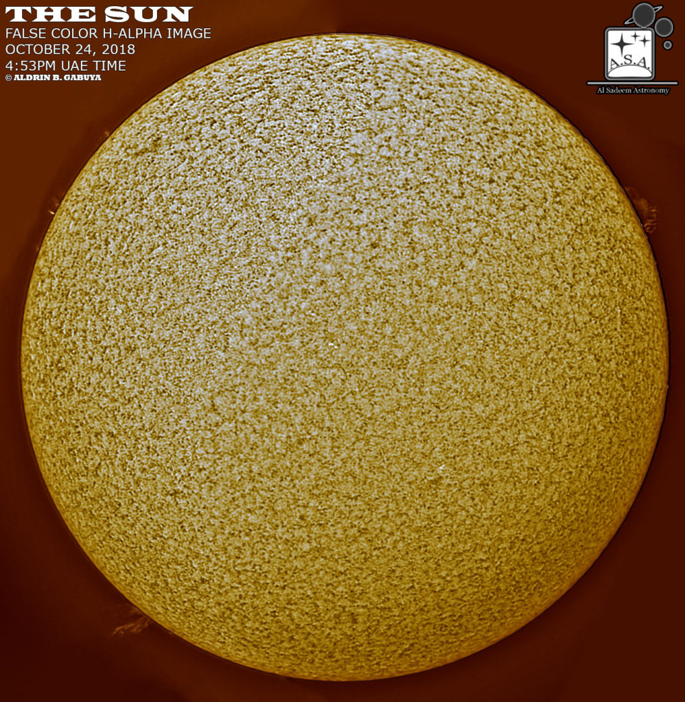 Here are today’s solar images taken from Al Sadeem Observatory, October 24, 2018. The sky was mostly clear (some light cirrus clouds passing) with light air turbulence making the seeing and transparency good at the time these images were taken.
