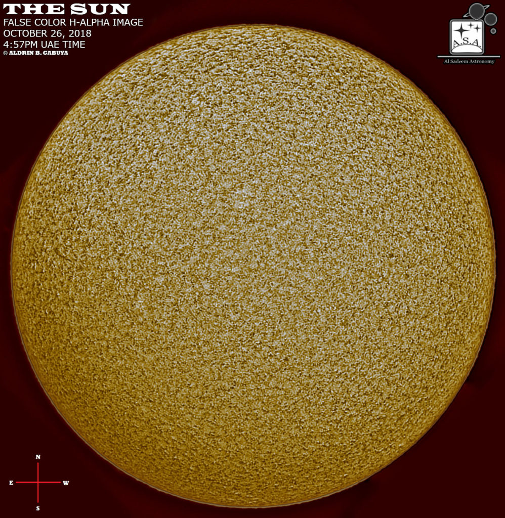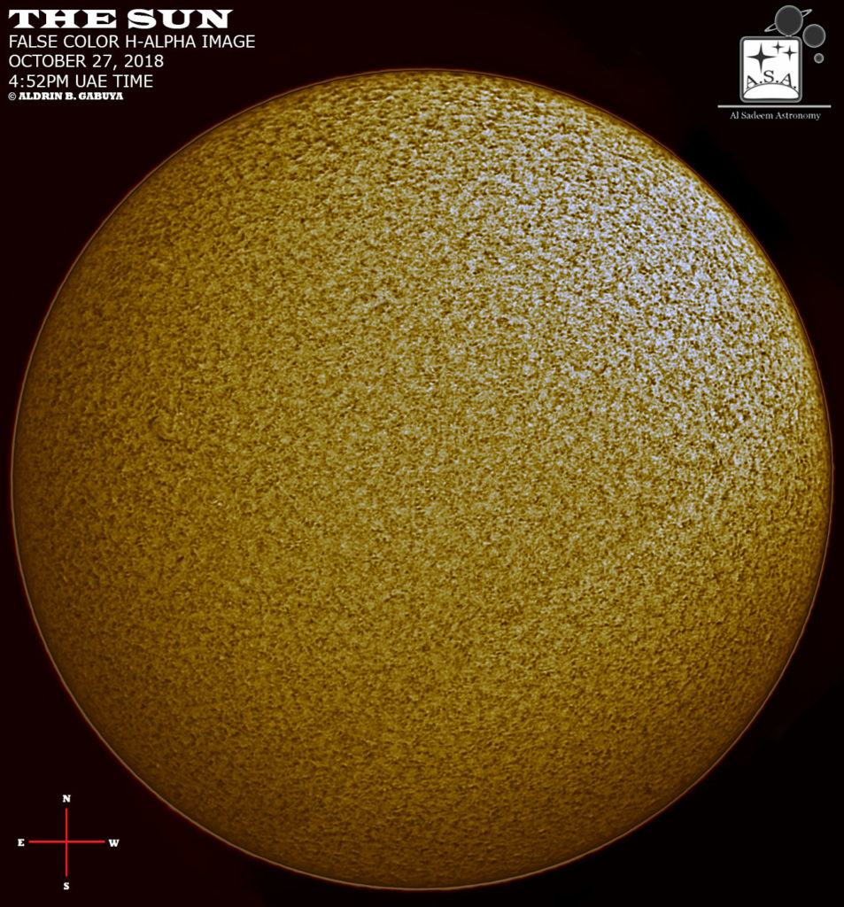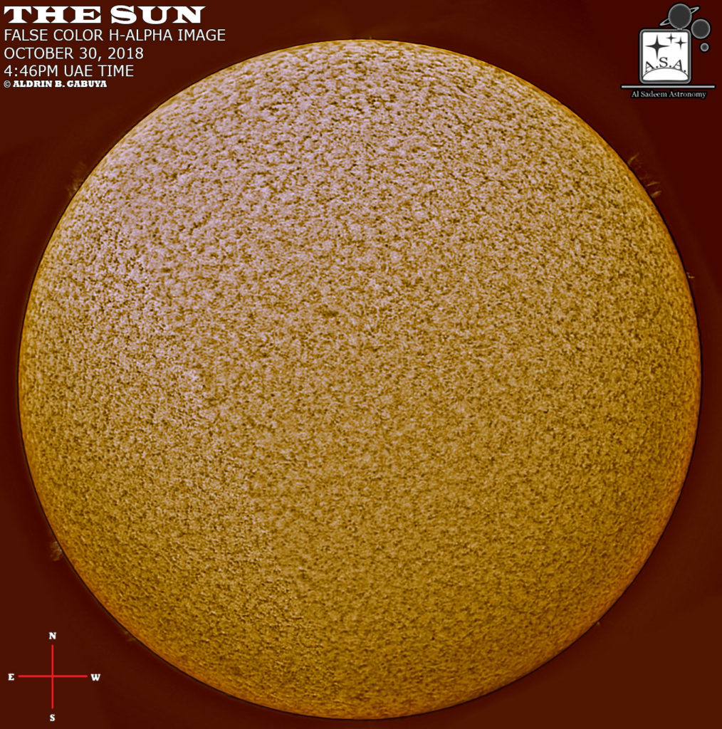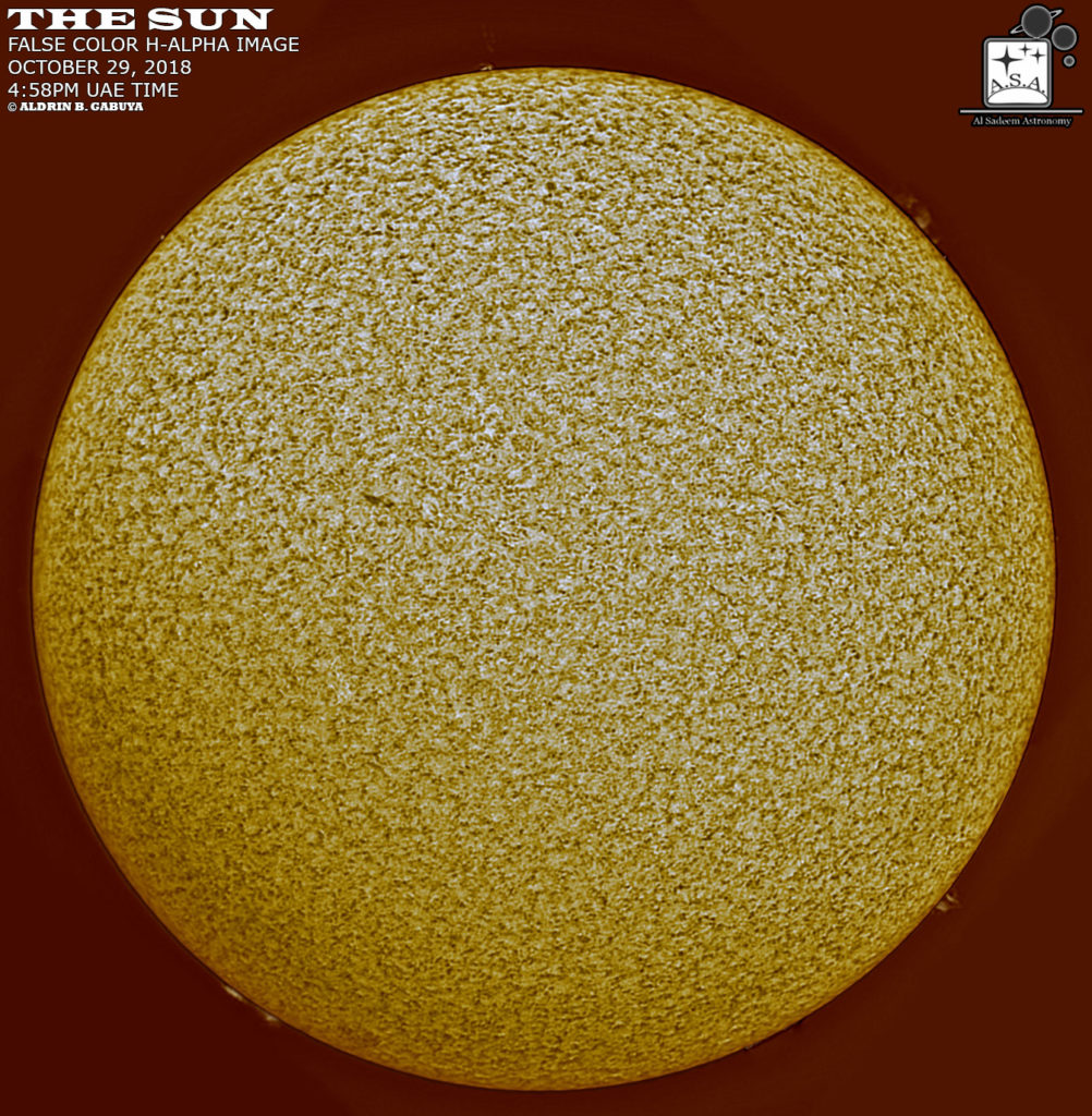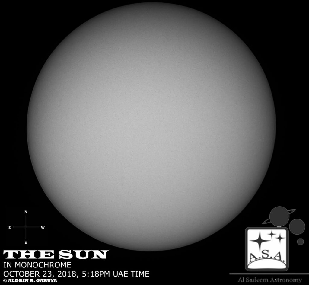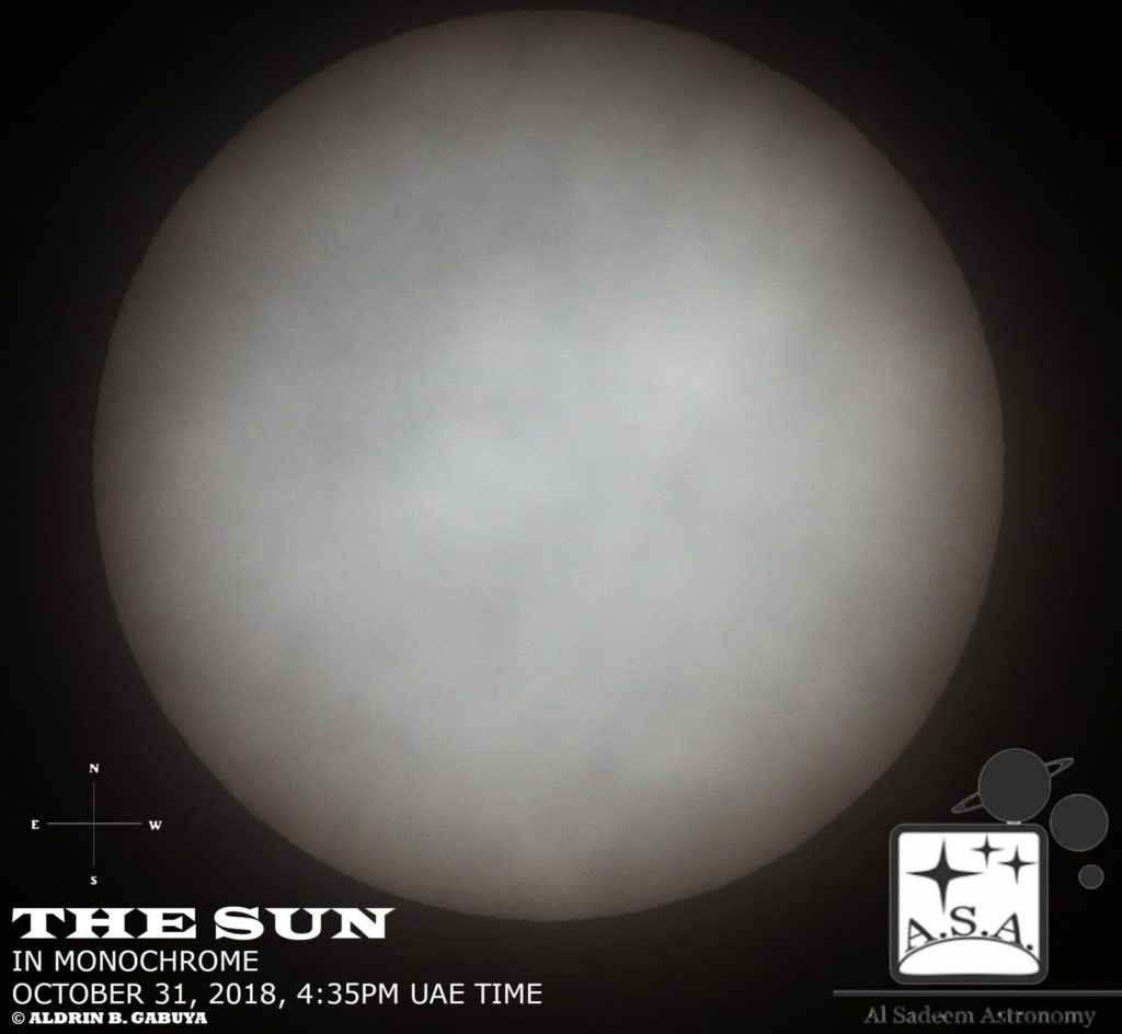 Here is the white-light imagery of the Sun taken from Al Sadeem Observatory, October 31, 2018. Only one solar image was taken due to the presence of haze/scattered high cirrus clouds (then clouded out completely afterwards) at the time these images were taken.